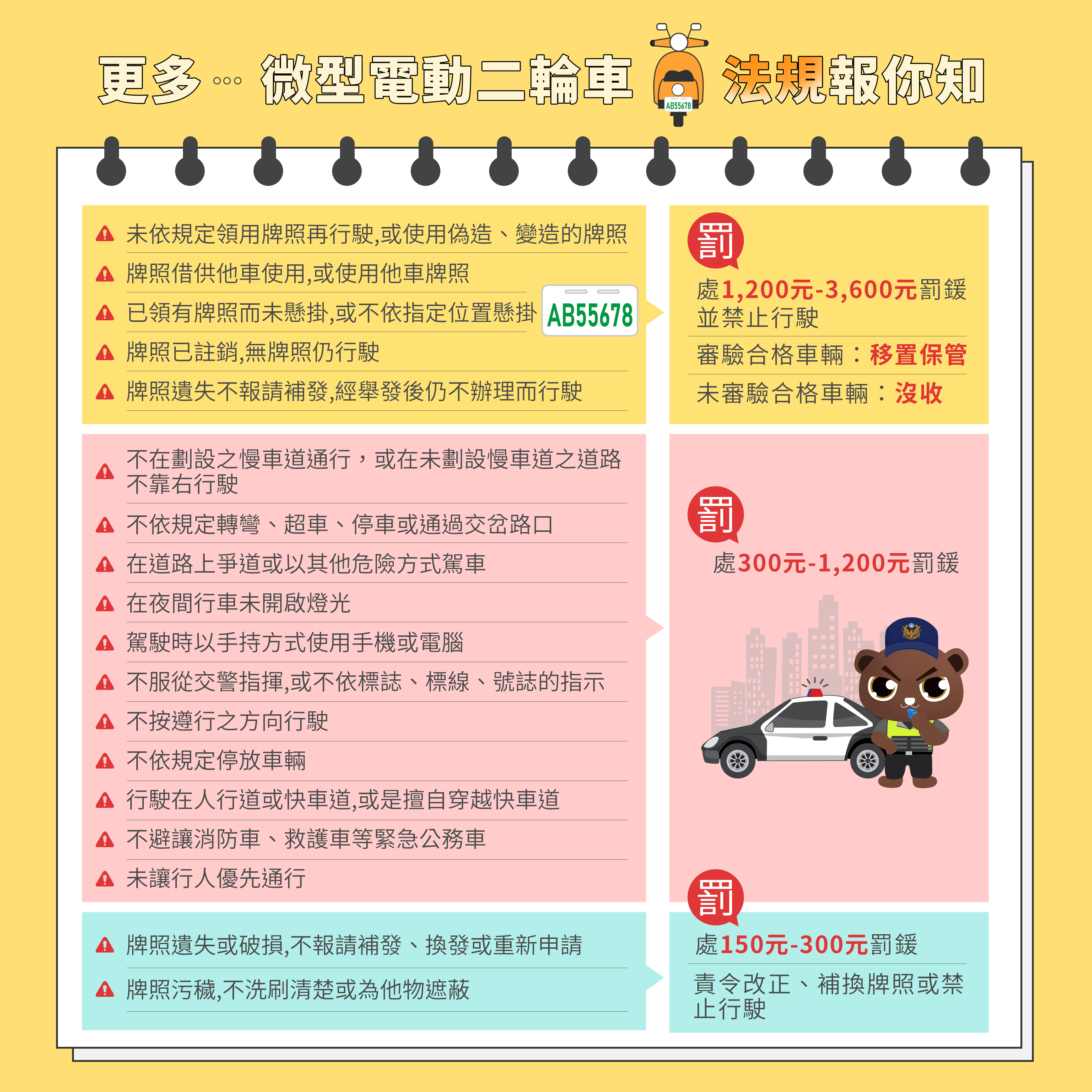 自2022年11月30日起,舊稱為電動自行車之「微型電動二輪車」正式納管,兩年內(2024年11月29日前)需完成掛牌、投保強制險才可以上路騎乘。新法規實施後,微型電動二輪車之行駛也需符合未滿14歲不得騎乘、不得擅自改裝、時速上限25公里等相關規定,違反者將處最高5400元罰鍰。