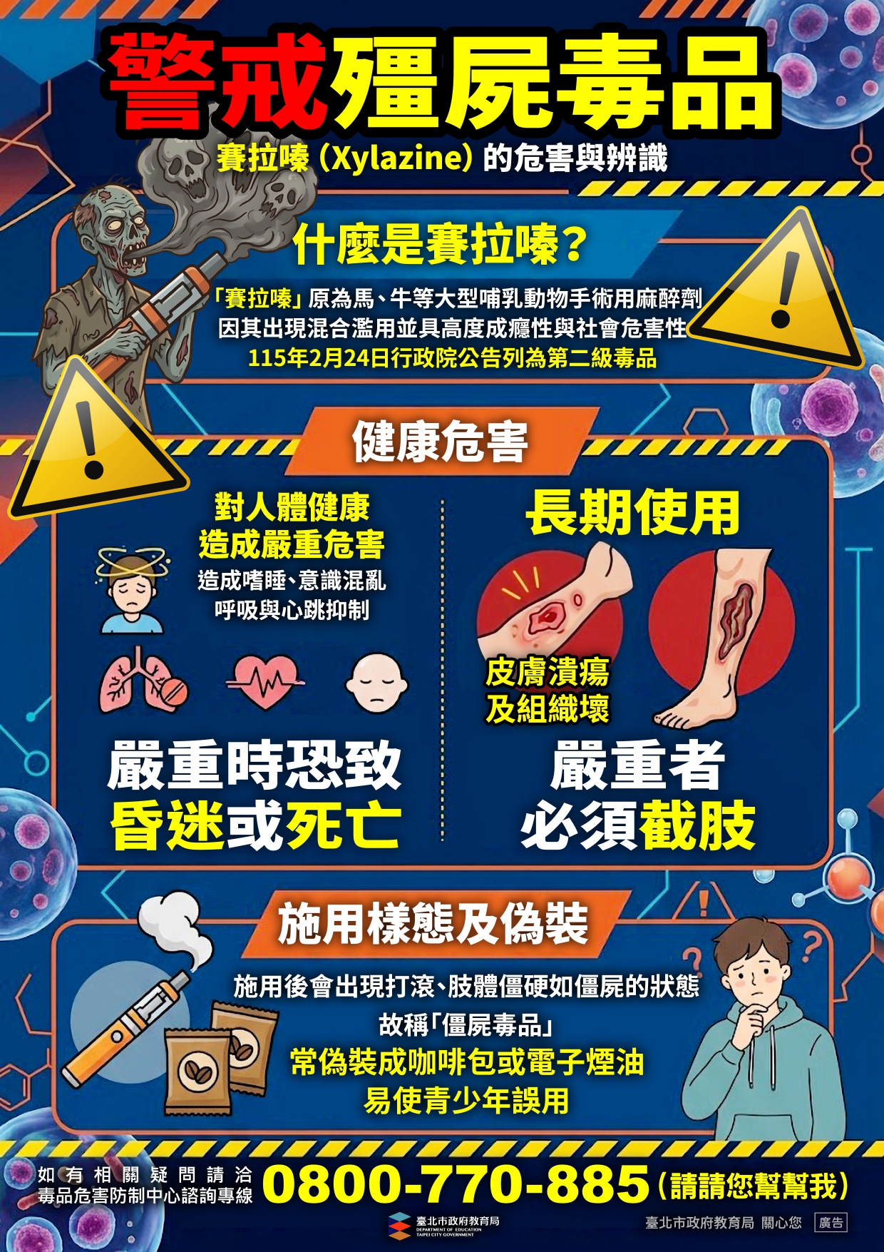 二、「賽拉嗪(Xylazine)」原為獸醫使用之麻醉藥物,近年 遭濫用並常與其他毒品混合使用,施用後會出現打滾、肢 體僵硬如僵屍的狀態, 故稱「僵屍毒品」。