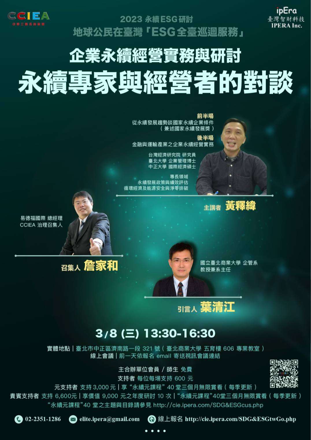 二、為地球永續發展,達到環境共生、社會和諧、治理良善, 首場研討會訂於:112年3月8日(三)13:30-16:30假臺北市中 正區濟南路一段321號(臺北商業大學五育樓606專業教 室)。研討主題:永續專家與經營者的對談。