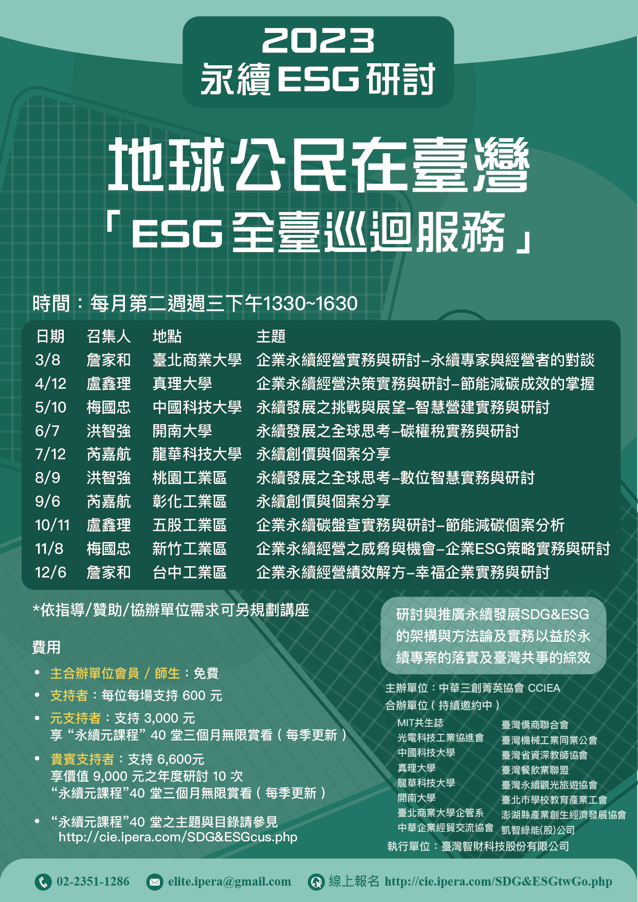 一、中華三創菁英協會主辦,臺北市學校教育產業工會合辦【地球公民在台灣】 【ESG全臺巡迴服務】系列活動,敬邀全國各公私立大學相 關學院與系所教師踴躍參加。