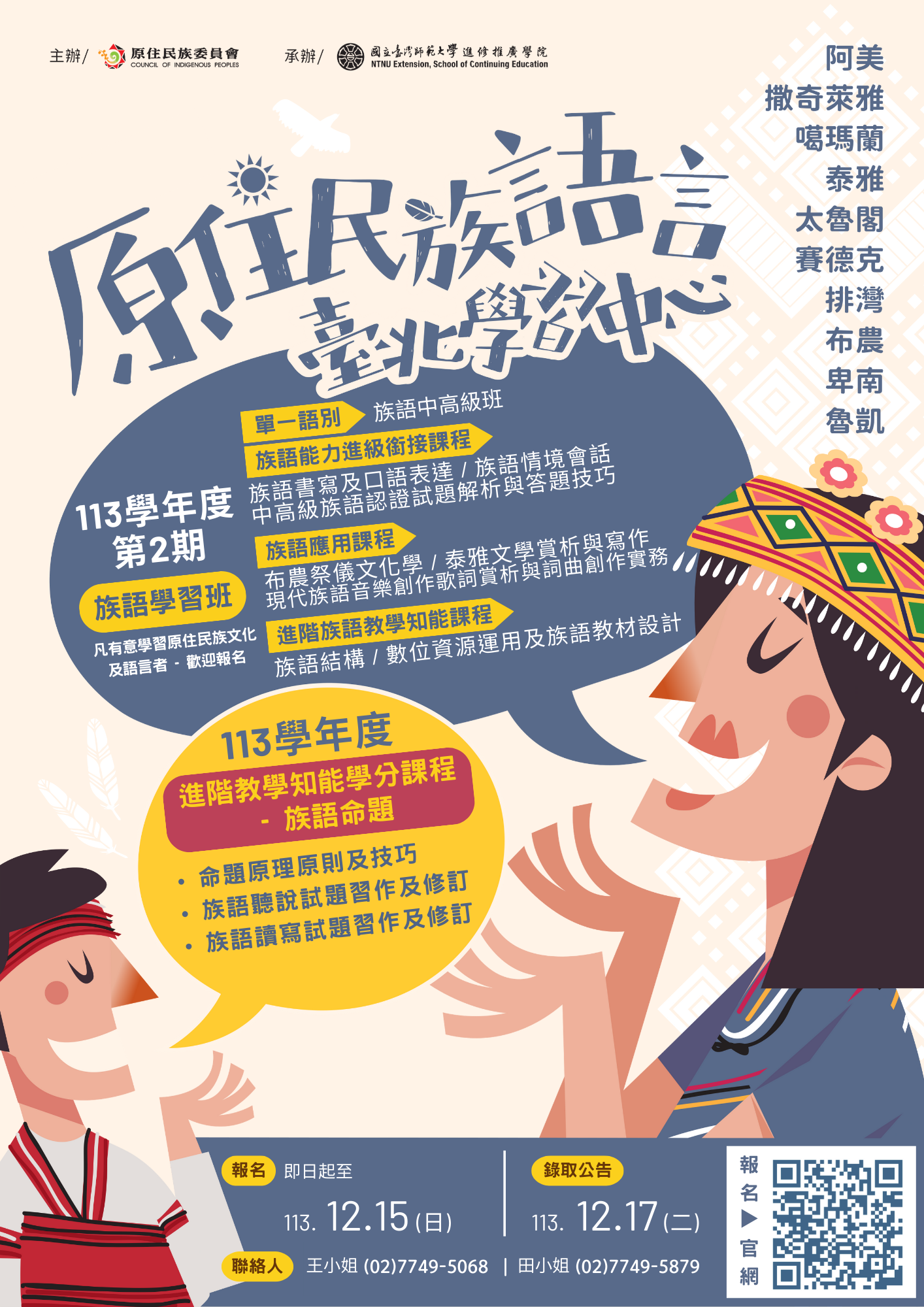 二、為協助培育原住民族語言師資,強化其命題能力,期有效 提升評量設計的質與量,同時協助強化命題技巧之傳承, 本校於113學年度持續辦理旨揭專班。