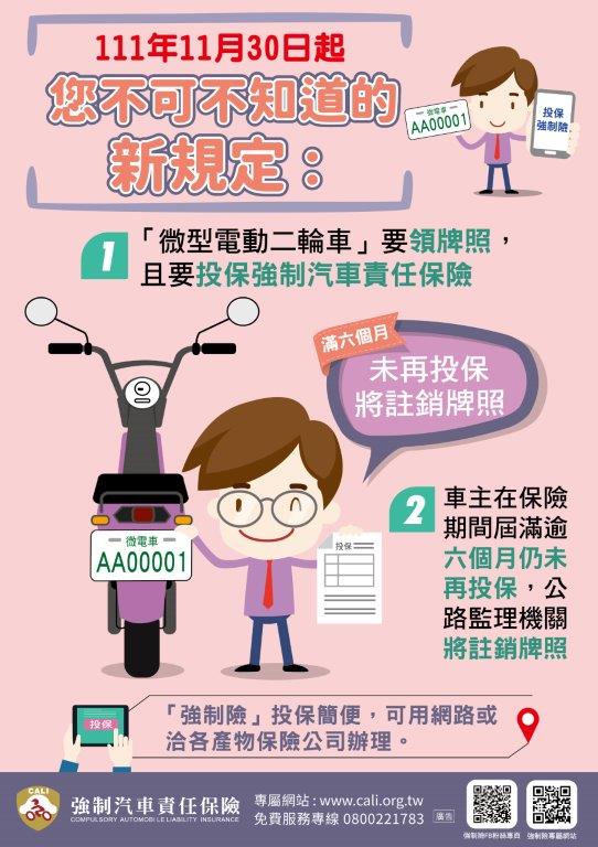 111年11月30日起,微型電動二輪車須登記領牌,並投保強制險,始得行駛道路。考量微型電動二輪車之使用者,以學生及高齡者居多,爰請協助多加宣導,以利政策推動並保障用路人權益。