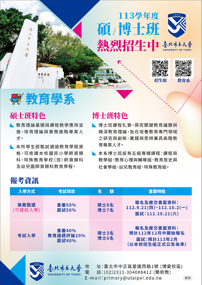 本校推薦甄選招生簡章自即日起可免費上網下載 https://admission.utaipei.edu.tw/ 。 三、報名及繳交書面資料時間:112年9月21日(星期四)至112 年10月2日(星期一)。 四、面試時間:112年10月21日(星期六)
