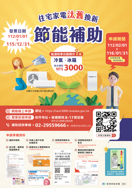 (四)補助專屬網站:https://save3000.moeaea.gov.tw (五)補助諮詢專線:02-2955-9666