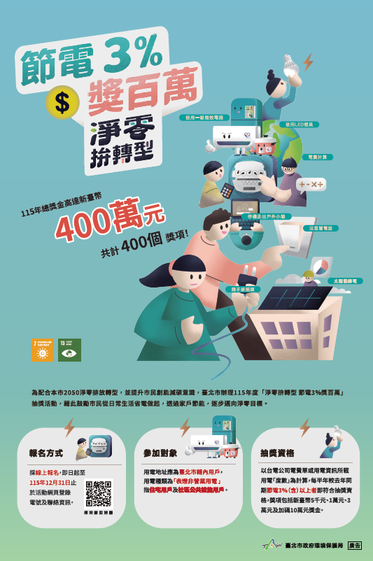 一、為鼓勵市民落實節能減碳行動,本局115年「淨零拚轉型 節電3%獎百萬」抽獎活動(網址: https://energysaving. gov.taipei/),即日起至115年 12月31日辦理。