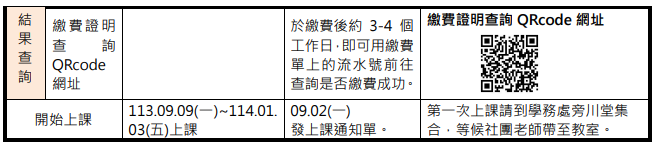 113學年度上學期新生社團繳費,原訂8/30開始,因考量開學繳費項目眾多,為方便家長繳費作業,本學期社團繳費將配合學雜費繳費時間,預計於9/19開始收費。 課程則如期於9/9(一)開始上課。