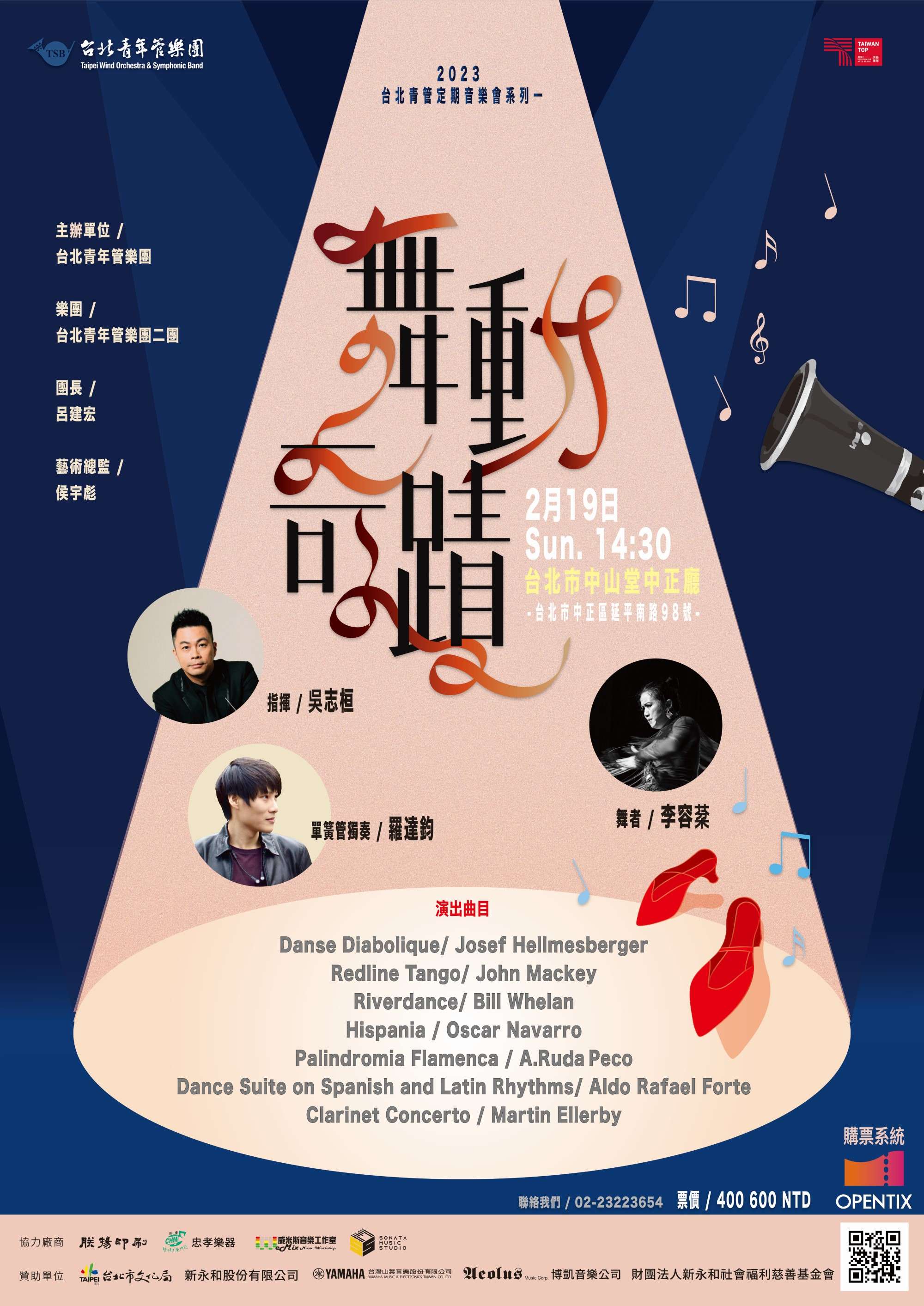 一、2023台北青管定期音樂會系列一,由台北青年管樂團二團 演出、指揮吳志桓,並邀請佛朗明哥舞者李容棻同台演 出,單簧管獨奏家羅達鈞演出協奏曲,帶來一連串好聽悅 耳的舞曲,不可錯過。
