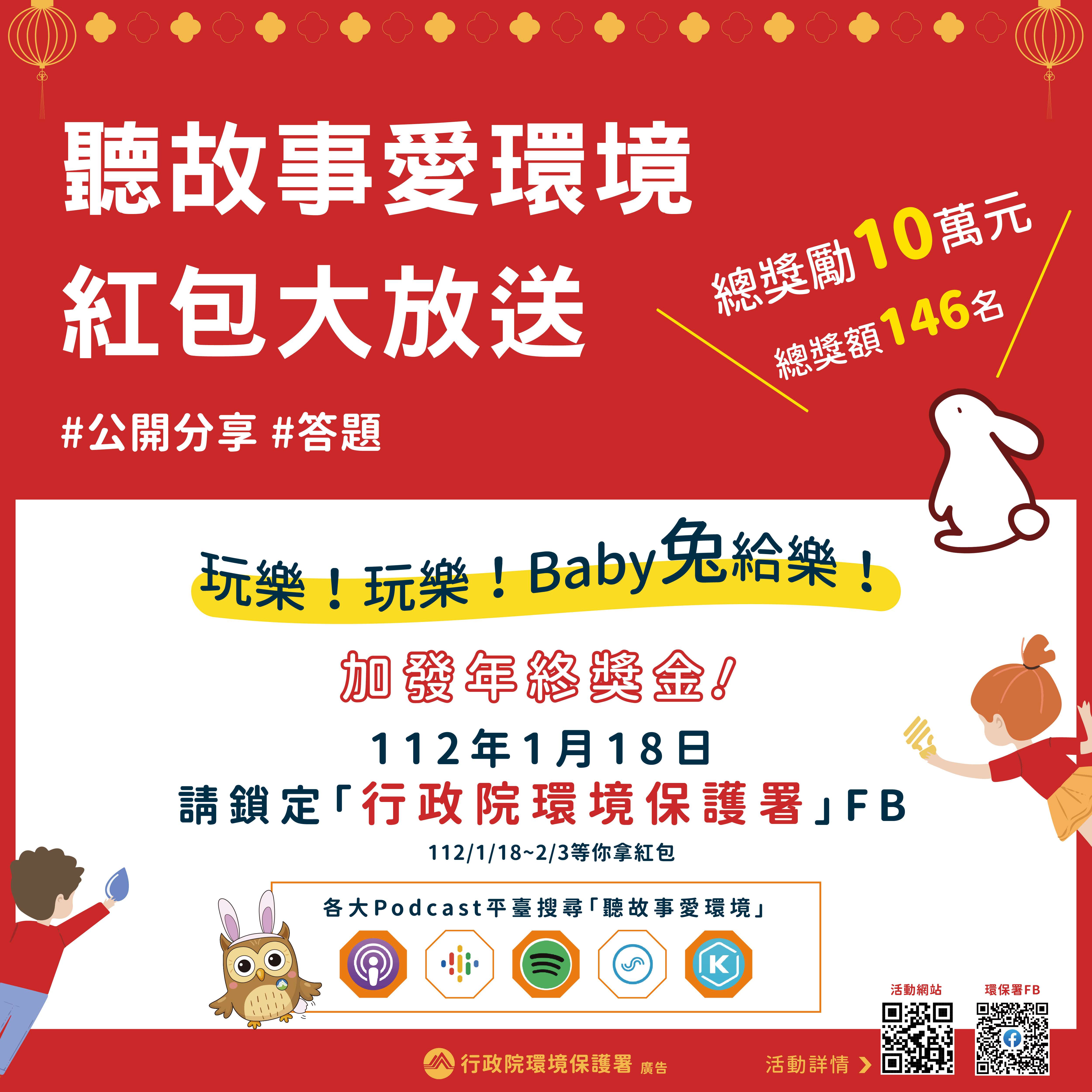 ◎為增進「聽故事愛環境」節目效益,於農曆新年期間辦理旨揭活動,本活動期間為112年1月18日(星期三)至2月3日(星期五),只要至「行政院環境保護署」臉書粉絲專頁完成指定「任務題」或「知識題」,即可有機會抽中超商禮券或環保綠點,總獎額146名,總獎值高達新臺幣 10 萬元。