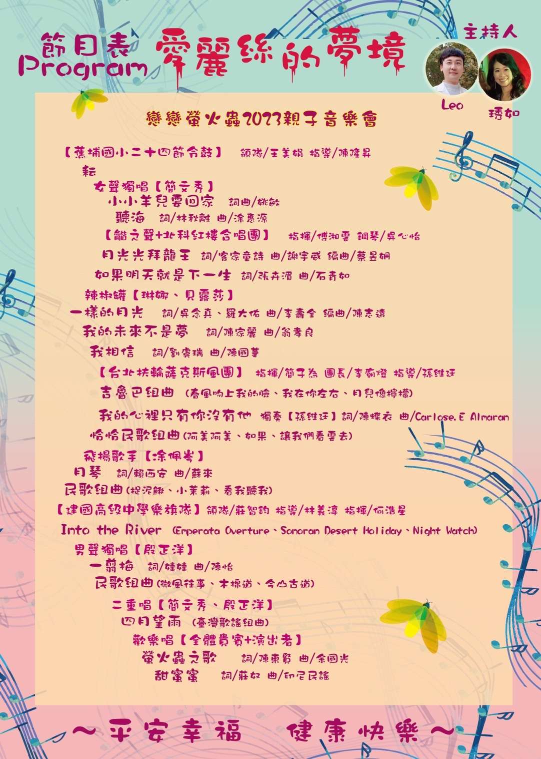 二、本次音樂會將邀請聲樂家簡文秀教授、殷正洋、凃佩岑、 孫維廷、辣椒罐、台北扶輪薩克斯風團、建國高級中學樂 旗隊、蕉埔國小二十四節令鼓、龤之聲+北科紅樓合唱團等 團體共同演出,是為一場親子同歡的音樂會 。