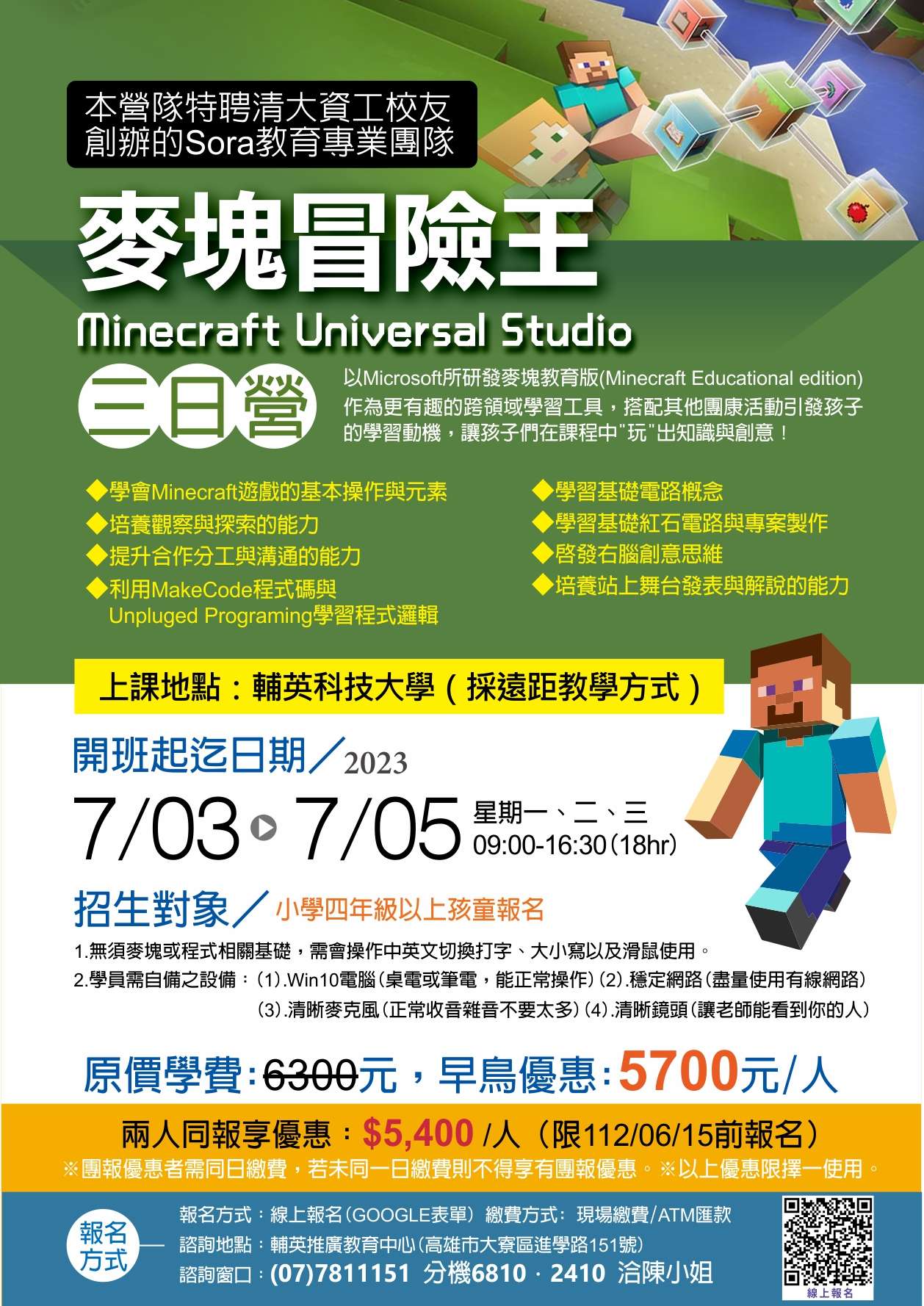 一、課程特色:以Microsoft所研發麥塊教育版(Minecraft Educational edition)作為更有趣的跨領域學習工具,搭 配其他團康活動引發孩子的學習動機,讓孩子們在課程中 『玩』出知識與創意