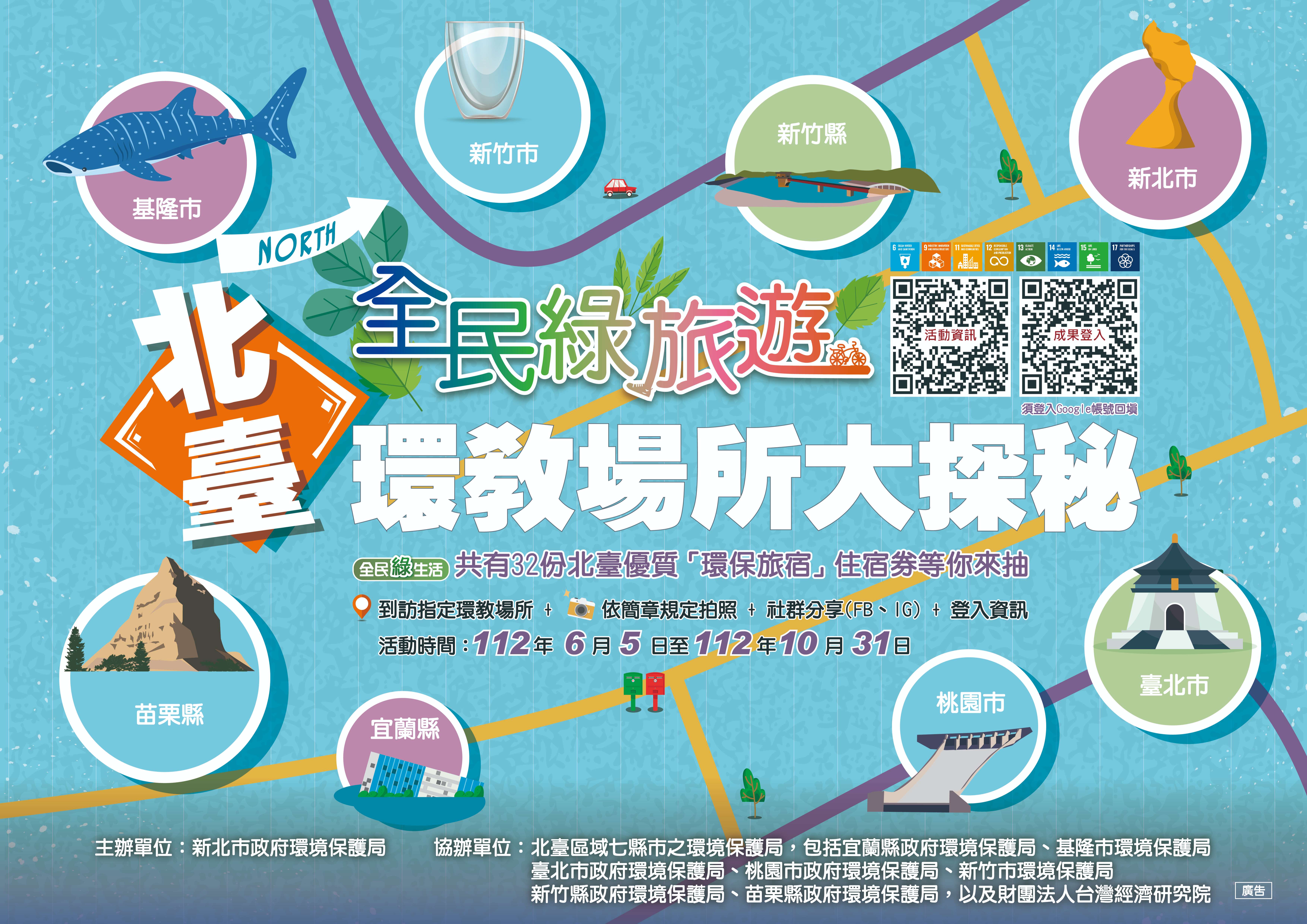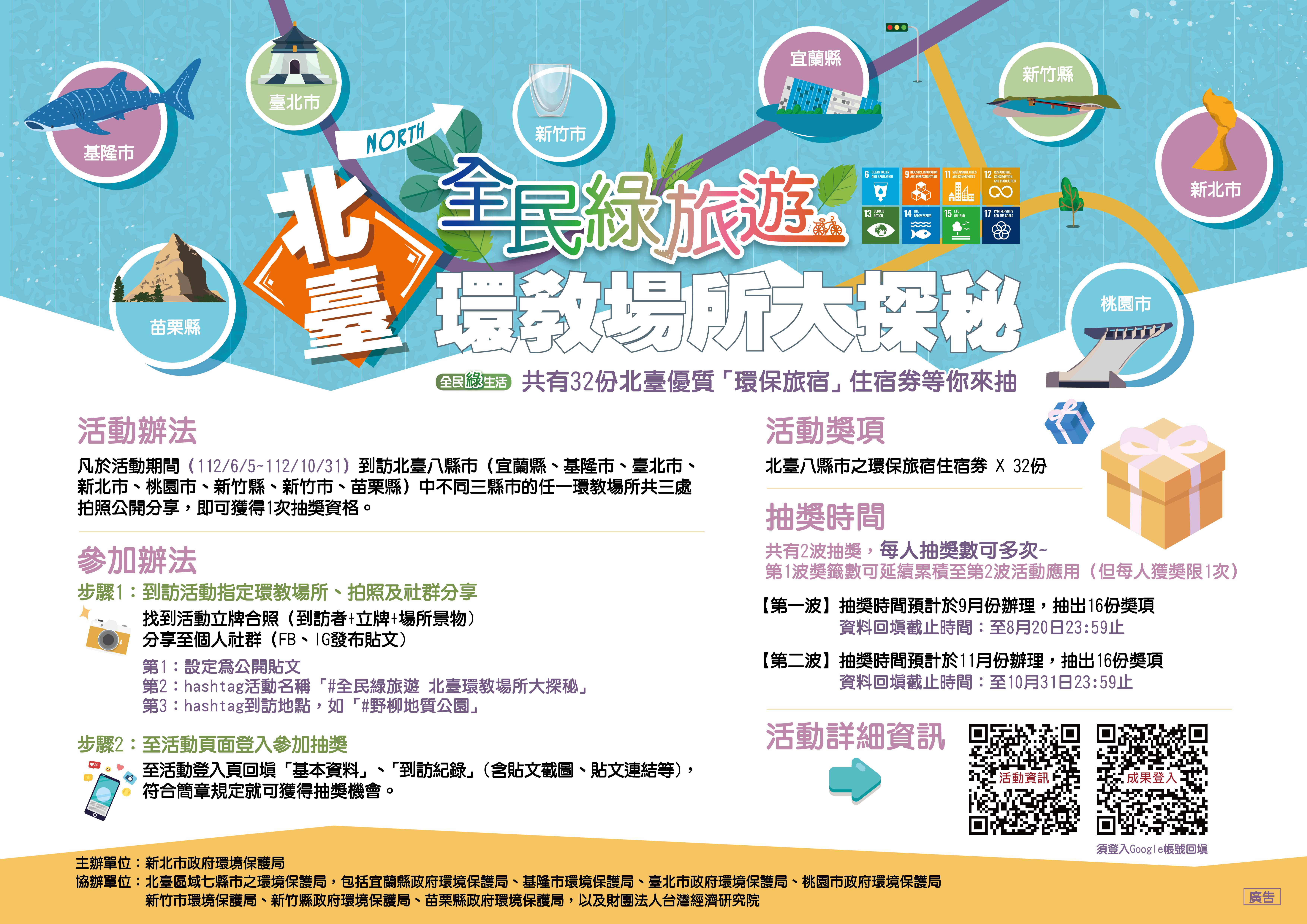 (一)凡本國籍之學生及民眾於112年6月5日至 10月31日期間 到訪北臺八縣市中(包括宜蘭縣、基隆市、新北市、臺 北市、桃園市、新竹縣、新竹市及苗栗縣)不同三縣市的環境教育設施場所共三處依活動規定拍照公開分享, 即可獲得1次抽獎資格,每人抽獎數可多次,但所有抽獎 數之到訪場所不得重複,且獲獎限1次。