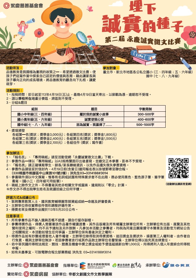 透過徵文活動,培養學生對於生活的觀察力,並從寫作中探索自我價值與思潮,讓品格教育的觀念向下扎根,以「埋下誠實的種子」為主題,希望學生從將品格素養融入文字的過程中,亦將優良德行落實於日常生活、徵文活動內容摘要如下: