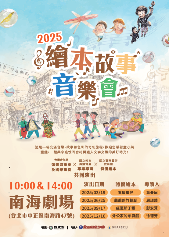 三、「2025年繪本故事音樂會」訂於114年3月19日(星期 三)、6月25日(星期三)、9月17日(星期三)及12月10日(星期三)等4日上午10時及下午2時,共計8場次,於該 館南海劇場(臺北市中正區南海路47號)演出,歡迎學校 師生踴躍報名。