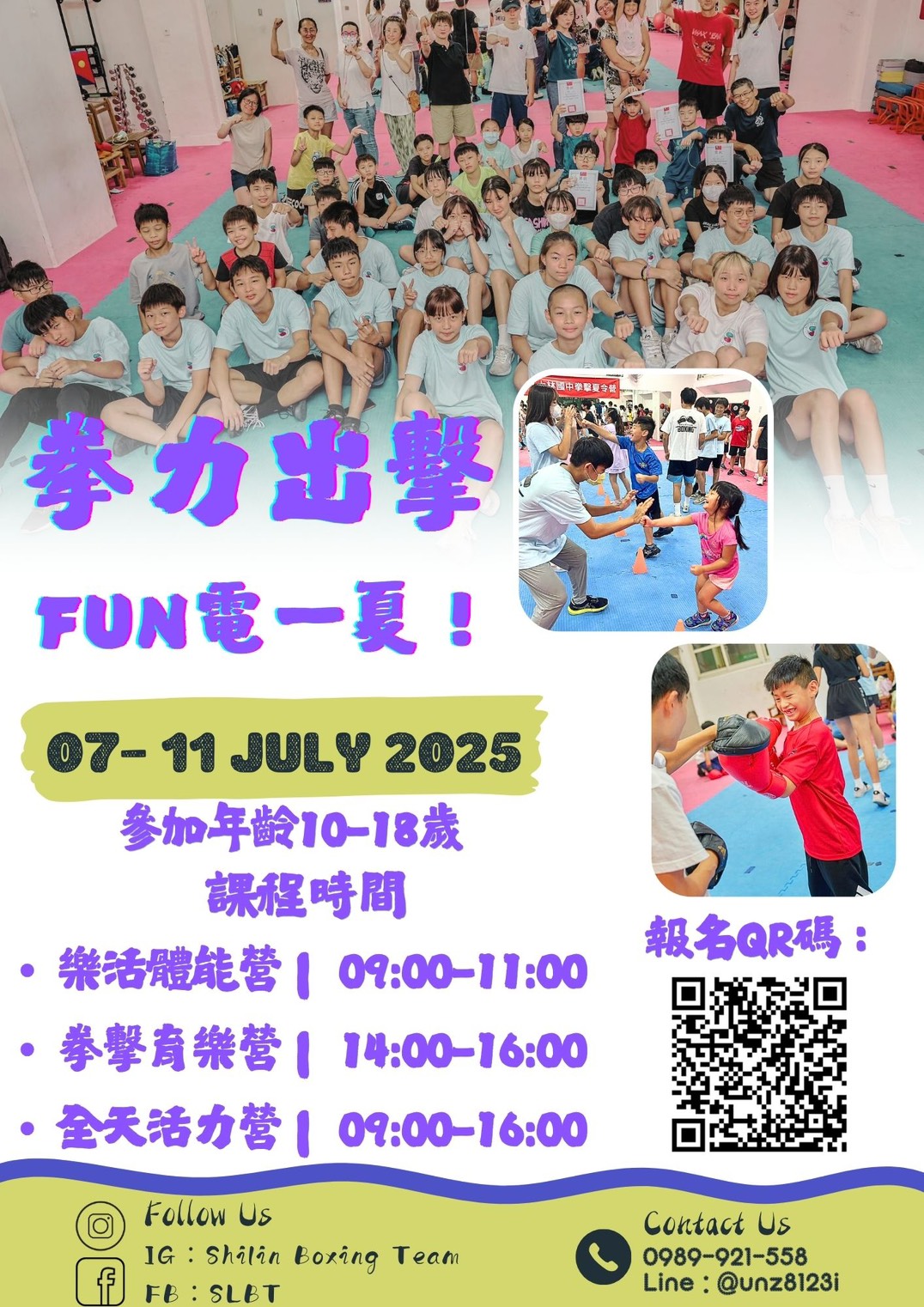 二、活動時間:(1)樂活體能營:114年7月7日至11日上午 09: 00-11:00共計 5 天。(2)拳擊育樂營:114年7月7日至11日 下午 14:00-16:00共計 5 天