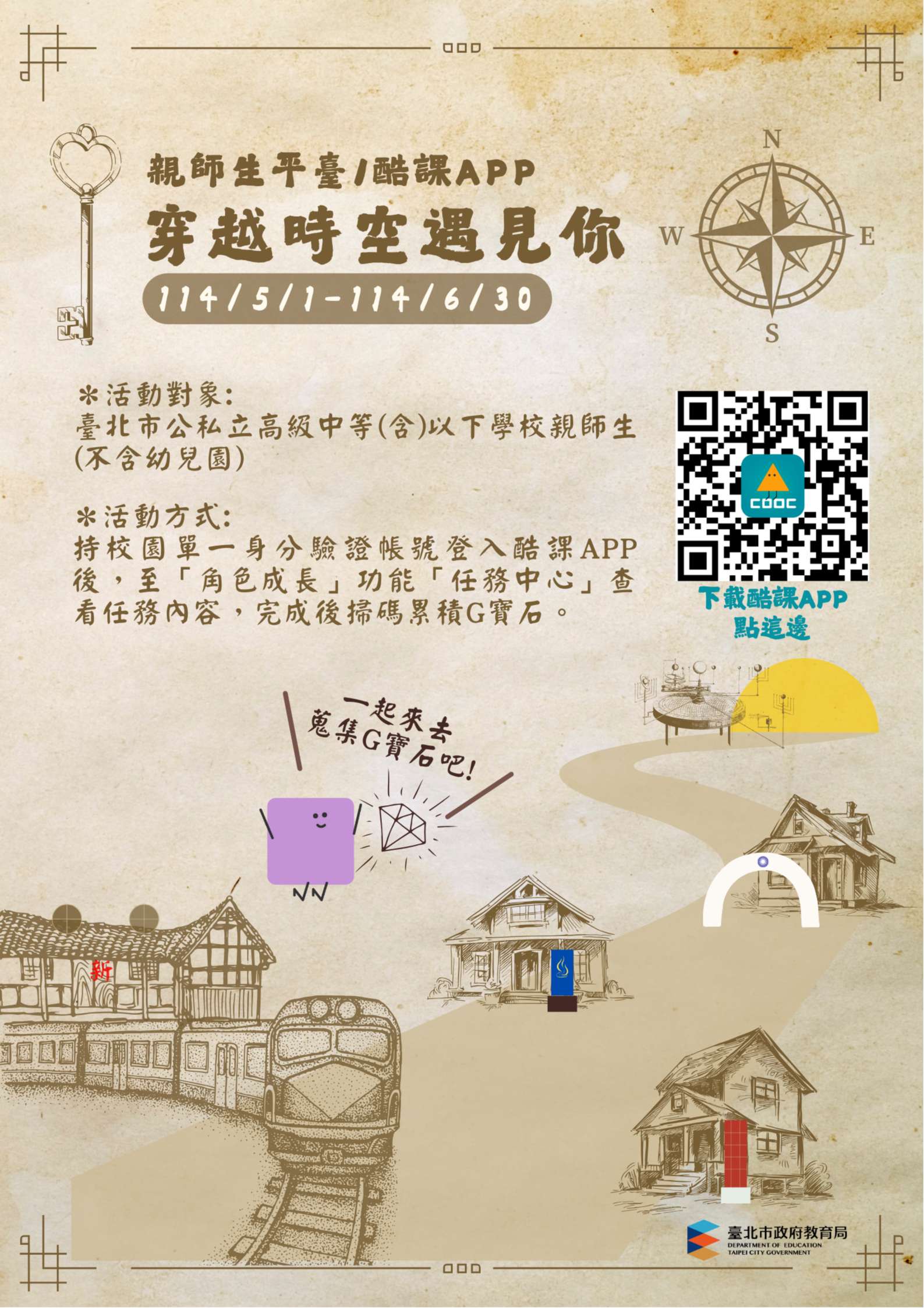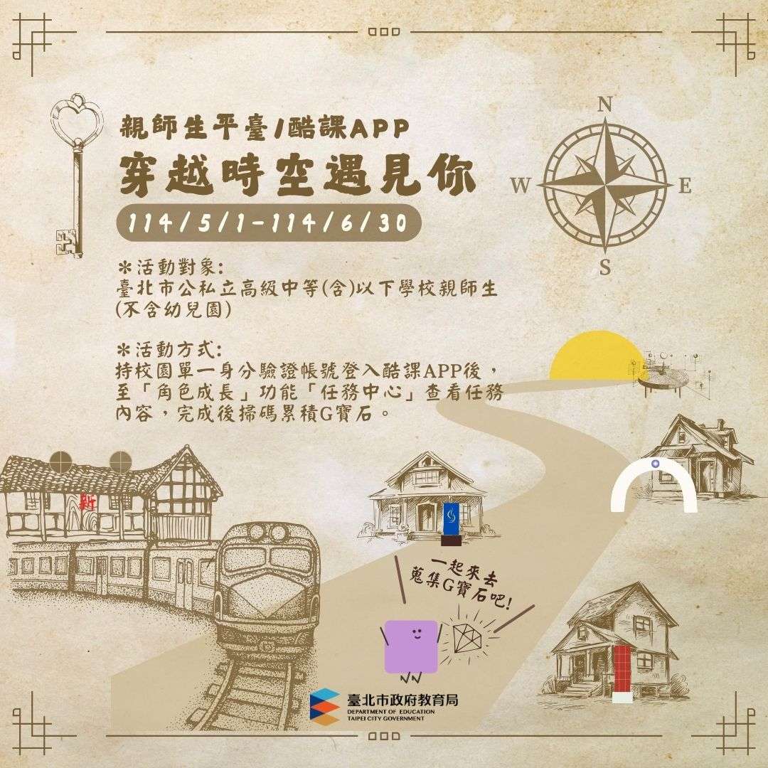 一、教育局建置「親師生平臺/酷課APP」,提供本市親師生多元 智慧校園服務,為激勵學生自主學習,本次活動與臺北市5 社教場館合作,於114年5月至6月舉辦「穿越時空遇見你」 活動任務,鼓勵學生實際走訪場館,深入了解臺北市的歷 史發展與在地文化。