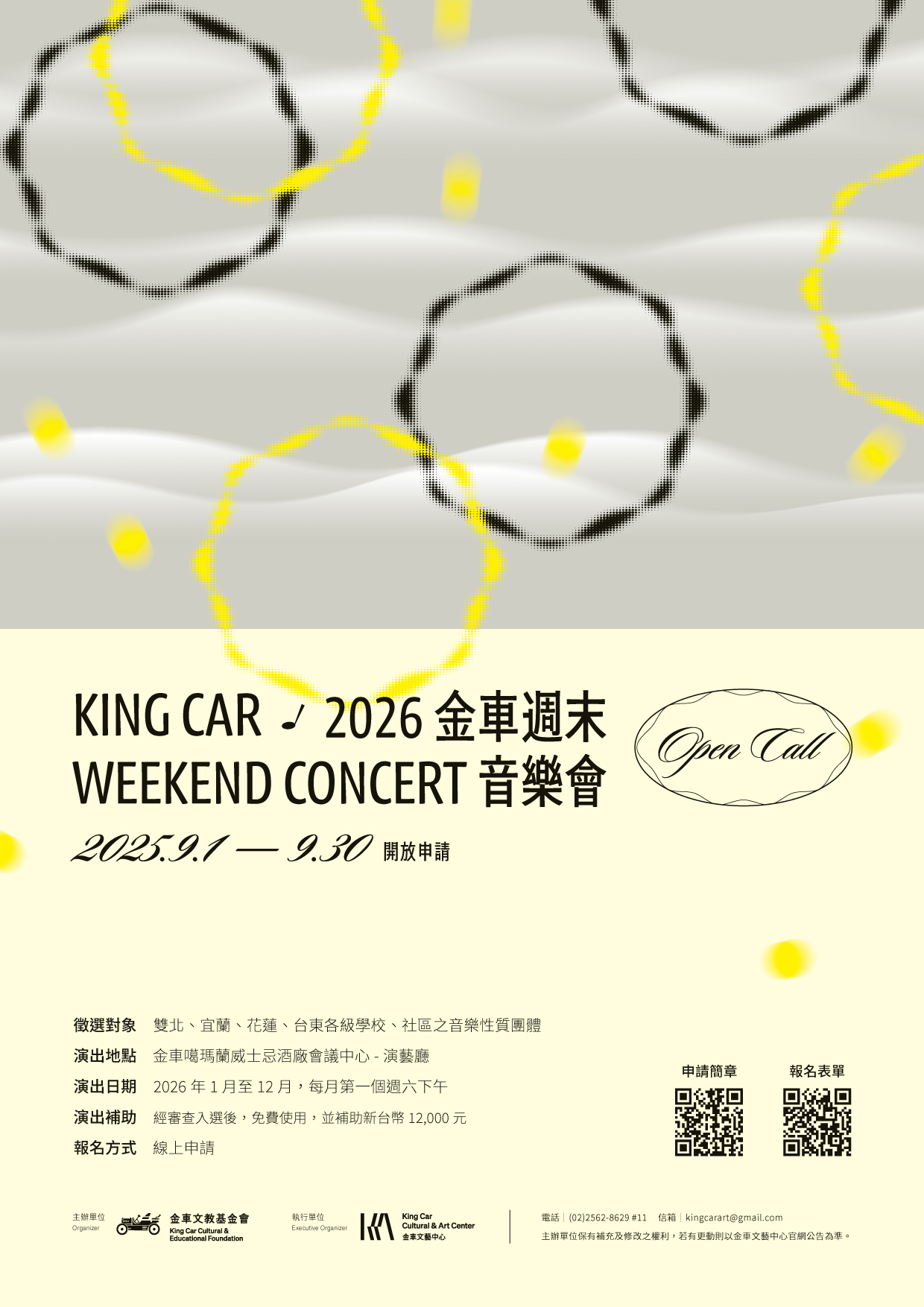 (六)參加費用:經審查通過後「免費使用」,並補助新台幣 12,000元 (七)申請方式:線上申請,詳情請上金車文藝中心官網/競賽 與徵件頁面查詢 (https://www.kingcarart.org.tw /projects-detail/180)