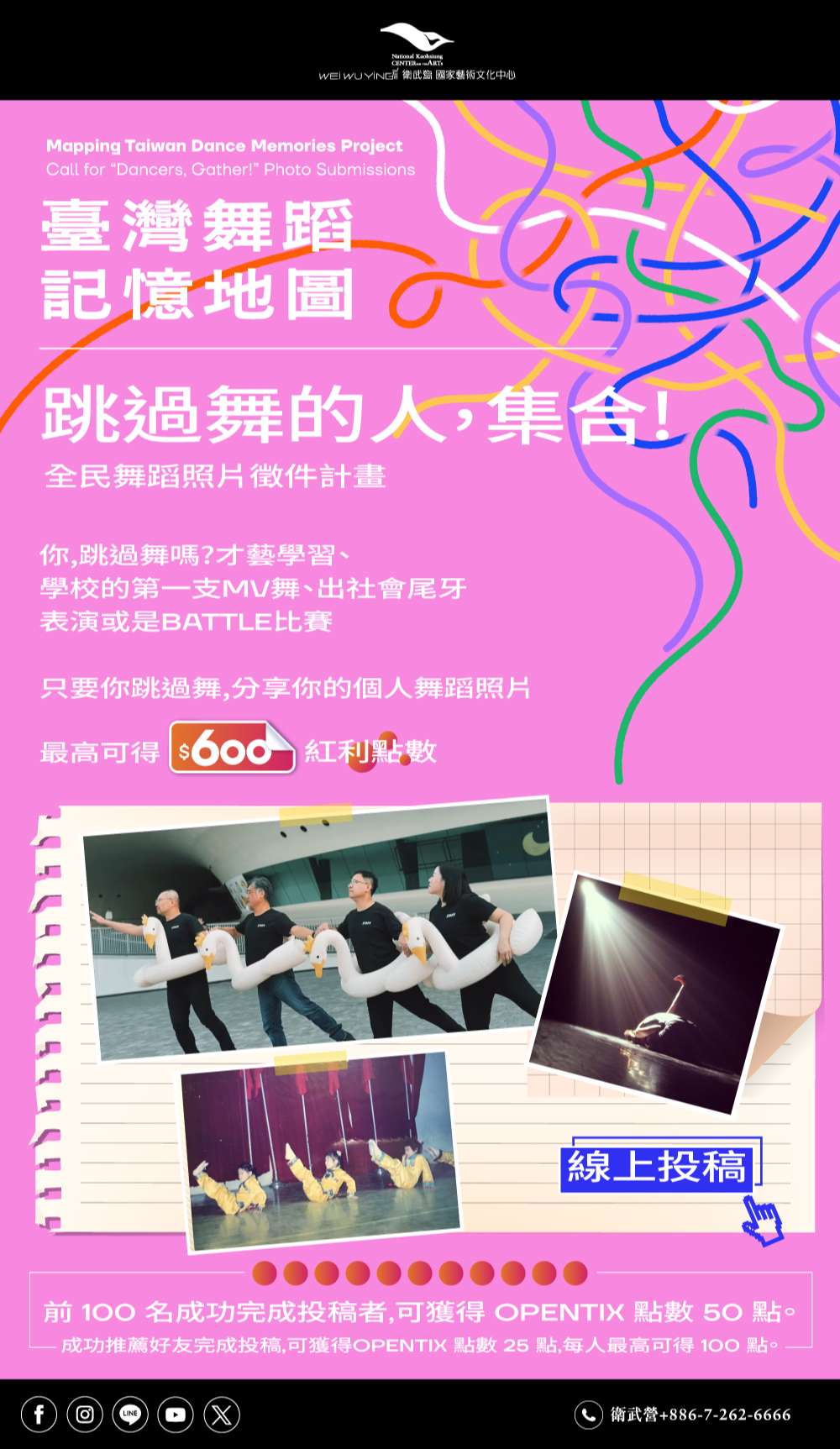(二)「跳過舞的人,集合!」全民舞蹈照片徵件活動參考簡 章(附件二)或衛武營官網網址:https://npacwwy.tw /en08gMrIj,邀請師生共同參與投稿,擴大舞蹈記憶之 蒐集與交流。
